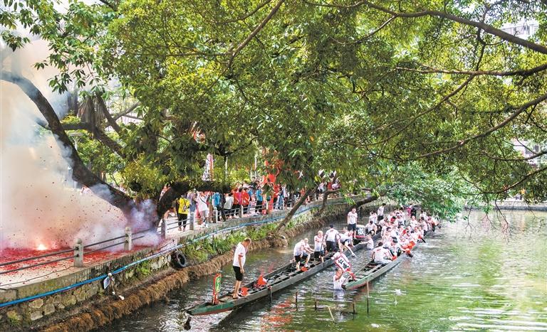 昨日,第十四屆“荔枝灣·新西關(guān)”民俗文化活動“五月五·龍船鼓”起龍儀式在廣州荔枝灣景區(qū)舉行。當(dāng)天上午,荔枝灣畔,人潮如織、鑼鼓喧天,泮塘村民歡聚于此,舉行一年一度的起龍儀式。有著400多年歷史的泮塘仁威老龍出水。圖為荔灣湖“龍船竇”起龍儀式。 廣州日報全媒體記者廖雪明 攝